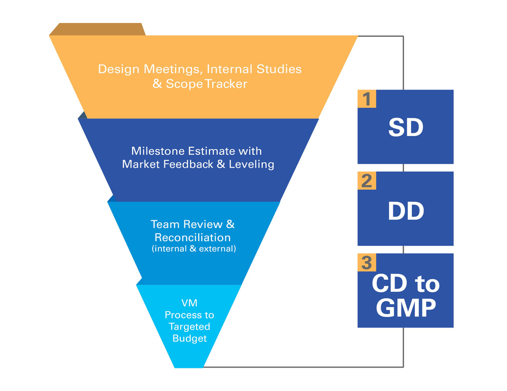 A project’s scope, program requirements, and current budget are evaluated at each design milestone. The accuracy and reliability of the Guaranteed Maximum Price (GMP) are directly related to the quality and diligence of each cost estimate provided. As the design progresses, the targeted GMP is adjusted with the current qualified subcontractor bids as well as the general conditions/general requirements, which represent the duration and difficulty of the project. This is a continually evolving process until a final GMP is reached.